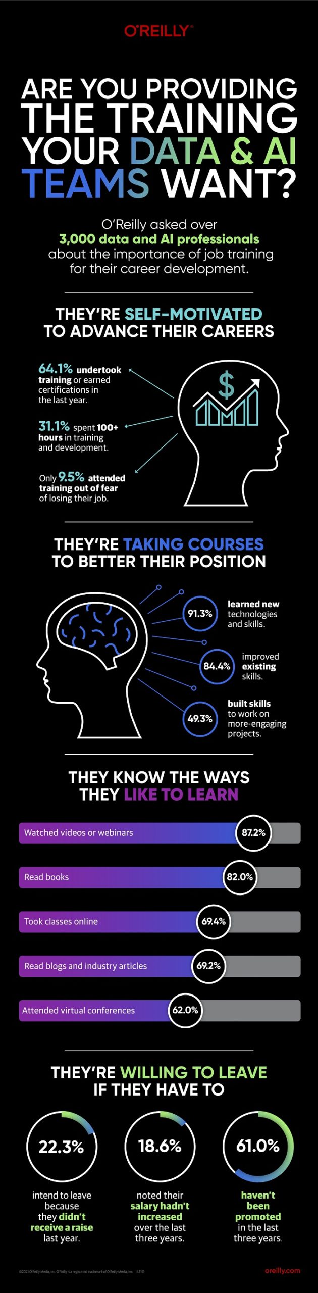 “Data and AI professionals are among the most driven employees when it comes to upskilling. Given the shortage of qualified employees in fields like data science, machine learning, and AI, companies that are serious about building out their workforces must invest in learning and training to grow this talent internally,” said Laura Baldwin, president of O’Reilly. “With such a wealth of knowledgeable talent and a recovering global economy hungry to fill tech roles in digital work environments, there’s never been a better time to invest in employee learning and reskilling.”