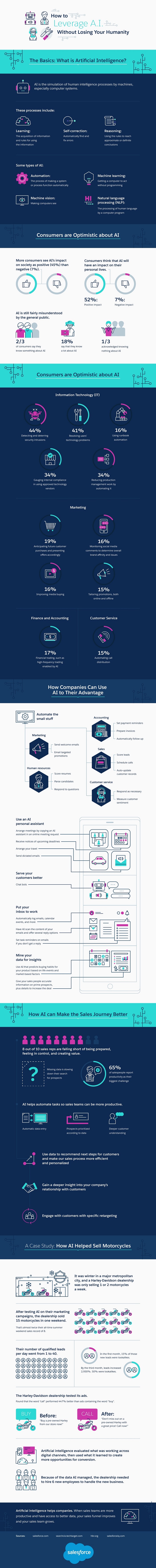 Our friends over at Salesforce Canada developed the compelling infographic below “How to Leverage AI Without Losing Your Humanity,” that explains how AI is helping companies. Artificial intelligence, or AI, is technology that learns, reasons, and self-corrects, and it’s being used by businesses to improve the customer journey. Automation, machine learning, machine vision, and natural language processing are the primary pillars of AI that companies can lean on to make their relationships with customers more personal.