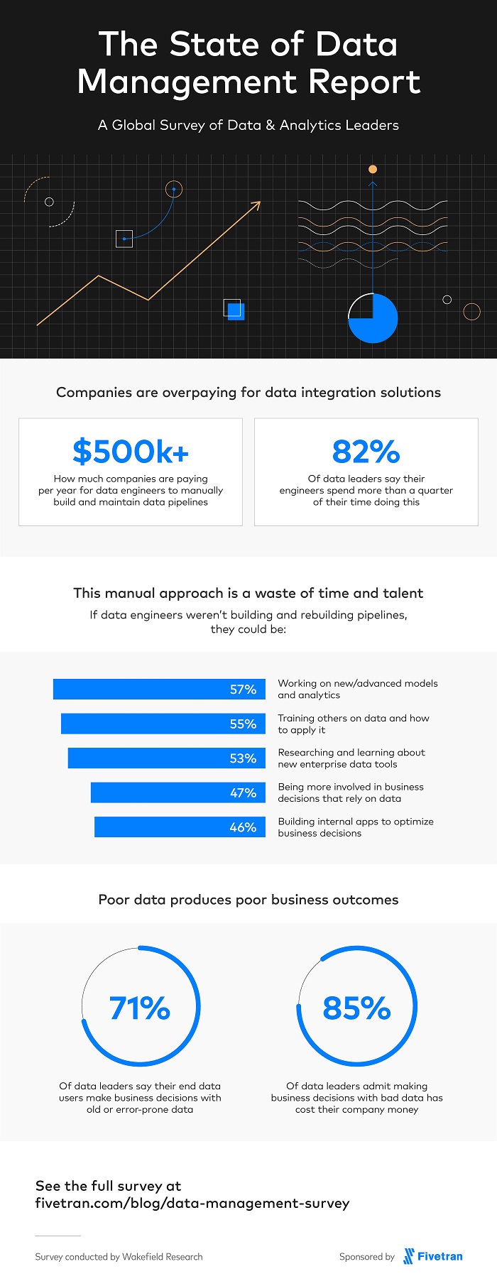As enterprises fiercely compete for data engineers, a new global poll out today by Wakefield Research and Fivetran, a leading provider of automated data integration, shows that, on average, 44 percent of their time is wasted building and rebuilding data pipelines, which connect data lakes and warehouses with databases and applications. This significant outlay of human capital isn’t adding up: 71 percent of respondents say end users are making business decisions with old or error-prone data — with 66 percent saying their C-suite doesn’t know this is even happening. As a result, 85 percent of enterprises have made bad decisions that have cost them money.