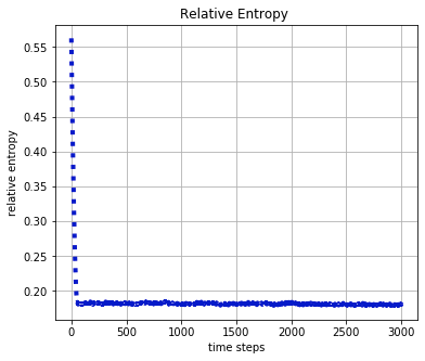 Relative entropy plot after running the QGAN: If P is the actual distribution taken and Q is the generated distribution, the closeness of the two distributions can be measured by relative entropy given by: