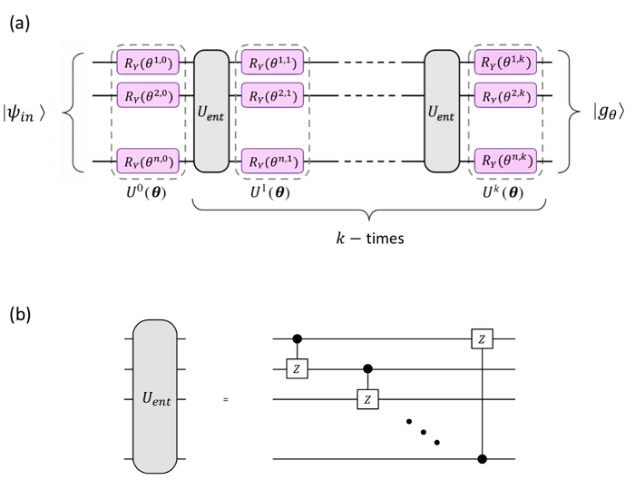 The variational form, depicted in (a), with depth k acts on n qubits. It is composed of k + 1 layers of single-qubit Pauli-Y -rotations and k entangling blocks Uent. As illustrated in (b), each entangling block applies CZ gates from qubit i to qubit (i + 1) mod n, i ∈ { 0, . . . , n − 1 } to create entanglement between the different qubits.
