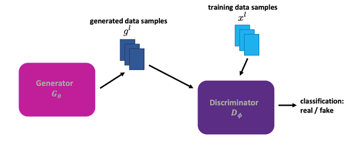 Suppose the real-world data comes from some fixed distribution pR(x), generated by some (potentially complex and unknown) process R. The generator – parameterized by a vector of real-valued parameters θ – takes as input an unstructured random variable z (typically drawn from a normal or uniform distribution). G transforms this noise source into data samples x = G(θ, z), creating the generator distribution pG(x). In the ideal case of a perfectly trained generator G, the discriminator would not be able to decide whether a given sample x came from pG(x) or from pR(x) . Therefore, the task of training G corresponds to the task of maximizing the probability that D misclassifies a generated sample as an element of the real data. On the other hand, the discriminator – parameterized by a vector of real-valued parameters φ – takes as input either real data examples x ∼ pR(x) or fake data samples x ∼ pG(x). D’s goal is to discriminate between these two classes, outputting a binary random variable. Training D thus corresponds to maximizing the probability of successfully classifying real data, while minimizing the probability of misclassifying fake data.