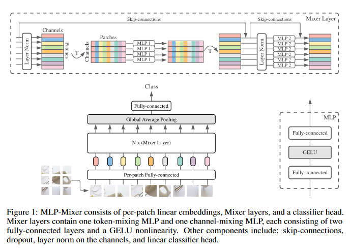 Convolutional Neural Networks (CNNs) are the go-to model for computer vision. Recently, attention-based networks, such as the Vision Transformer, have also become popular. This paper shows that while convolutions and attention are both sufficient for good performance, neither of them are necessary. Presented is MLP-Mixer, an architecture based exclusively on multi-layer perceptrons (MLPs). MLP-Mixer contains two types of layers: one with MLPs applied independently to image patches (i.e. “mixing” the per-location features), and one with MLPs applied across patches (i.e. “mixing” spatial information). When trained on large datasets, or with modern regularization schemes, MLP-Mixer attains competitive scores on image classification benchmarks, with pre-training and inference cost comparable to state-of-the-art models.