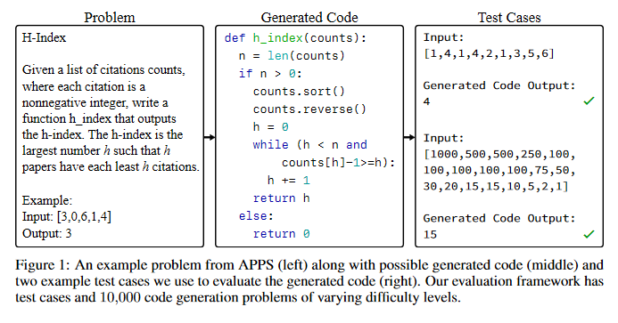 While programming is one of the most broadly applicable skills in modern society, modern machine learning models still cannot code solutions to basic problems. Despite its importance, there has been surprisingly little work on evaluating code generation, and it can be difficult to accurately assess code generation performance rigorously. To meet this challenge, this paper introduces APPS, a benchmark for code generation. Unlike prior work in more restricted settings, this benchmark measures the ability of models to take an arbitrary natural language specification and generate satisfactory Python code. Similar to how companies assess candidate software developers, the proposed solution then evaluates models by checking their generated code on test cases. The benchmark includes 10,000 problems, which range from having simple one-line solutions to being substantial algorithmic challenges. Large language models are fined-tuned on both GitHub and a special training set, and it’s found that the prevalence of syntax errors is decreasing exponentially as models improve. Recent models such as GPT-Neo can pass approximately 20% of the test cases of introductory problems, so it’s found that machine learning models are now beginning to learn how to code. The code associated with this paper can be found HERE.