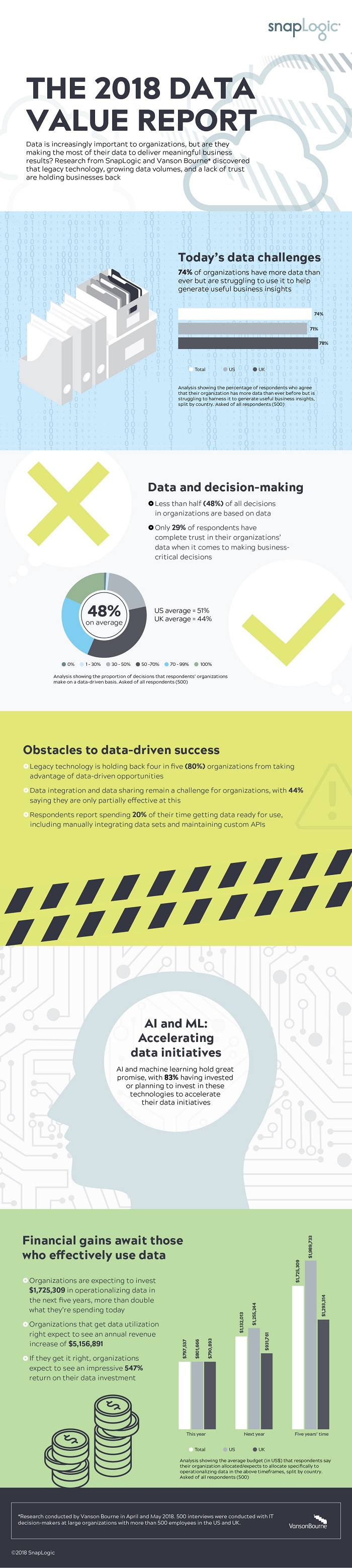 Our friends over at SnapLogic, a leader in self-service application and data integration, released “The 2018 Data Value Report,” a new study that reveals enterprises expect to generate a 547% return on their data investments, increasing revenue by an average $5.2 million as a result of using data more effectively. However, businesses have only scratched the surface in realizing data’s potential: On average, organizations are using only half (51%) the data they collect or generate, and data drives less than half (48%) of decisions.