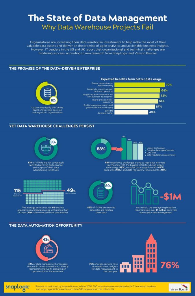Based on new research, “The State of Data Management – Why Data Warehouse Projects Fail” commissioned by SnapLogic and conducted by Vanson Bourne, who surveyed 500 IT Decision Makers (ITDMs) at medium and large enterprises across the US and UK, this whitepaper explores the data management challenges organizations are facing, the vital role data warehouses play, and the road to success.