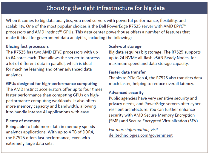 You also need to make sure that you have adequate hardware to support any data analytics projects. Often, regulations and security concerns make it desirable to house government big data stores on-prem. And in order to support these use cases, you need flexible, scalable servers with plenty of processor cores, memory, storage, and advanced GPUs. McKinsey & Company advises that organizations start small and add more hardware as it becomes necessary. “Add the elements of the data architecture incrementally, in line with the use case road map,” it says. “Not everything has to be in place from the start. Make sure, however, that the architecture is flexible enough to add new capabilities, as data and analytics needs scale.”