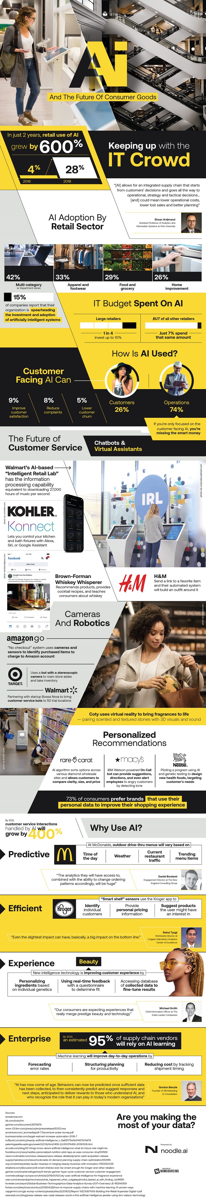AI for consumer goods starts in the supply chain. Since 2016, the use of AI in retail grew by 600%; and by 2021, customer service interactions handled by AI will grow by 400%. Are you ready for the impact of AI on your business? By 2023 we estimate that 95% of supply vendors in the consumer goods space will be leveraging AI learning – will you be one of them? The infographic below from our friends over at Noodle.ai outlines the emergence of AI in retail.