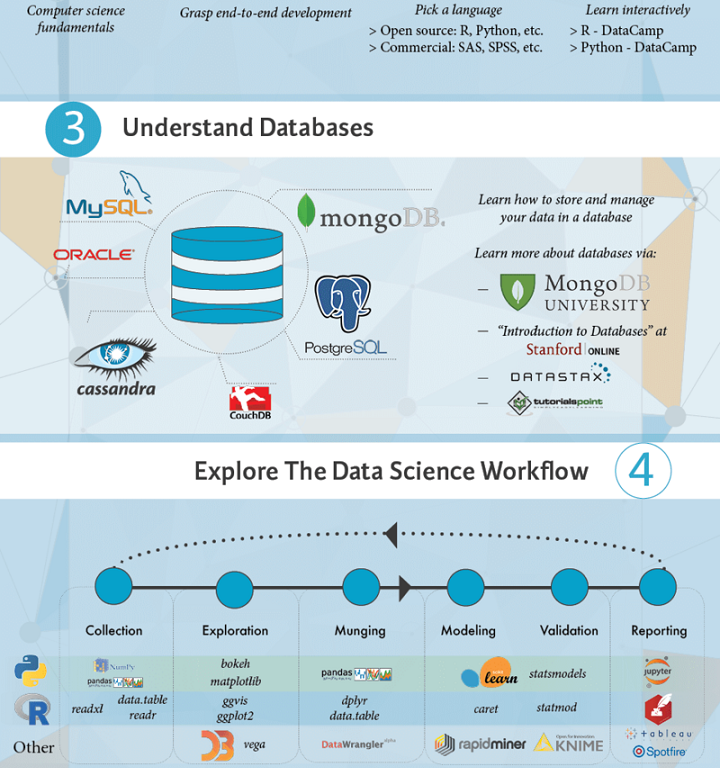 Our friends over at DataCamp have produced the “Become a Data Scientist in 8 Steps” infographic providing a view of the eight steps that you need to to through to learn data science. Some of these eight steps will be easier for some than for others, depending on background and personal experience, among other factors.