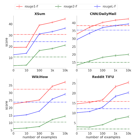 During pre-training, three variants of the ROGUE score were used (higher the better). In some cases, PEGASUS outperformed the baseline in under 100 examples, approaching the efficiency of GPT-3 with .3% of its parameters.