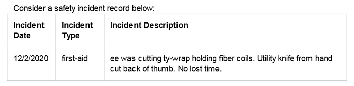 Operational records in enterprises are often functional/terse, contain typos and colloquialisms, and generally contain acronyms and jargon (e.g. ty-wrap = Tyvek wrap, ee = employee). This makes standard search and natural language modeling techniques somewhat ineffective. Additionally, there can be a myriad of ways to use the natural language so a comprehensive scheme for normalization is untenable. Eg. the incident above can be categorized by its severity (i.e. minor injury) or it could be categorized by point of injury (i.e. hand injury). The two categories are not mutually exclusive and need to be thought of as separate categorization schemes. Without high effort from SMEs, most natural language records are rarely analyzed and remain unutilized.