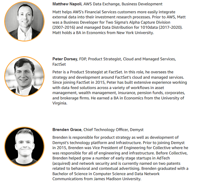 You will also hear from Demyst on how AWS customers can leverage the Demyst Platform to curate, test, and consume external data solutions customized for the financial services industry. Learn how to leverage financial services data sets in AWS services and begin the next phase of your company’s digital transformation to support its future growth and success.