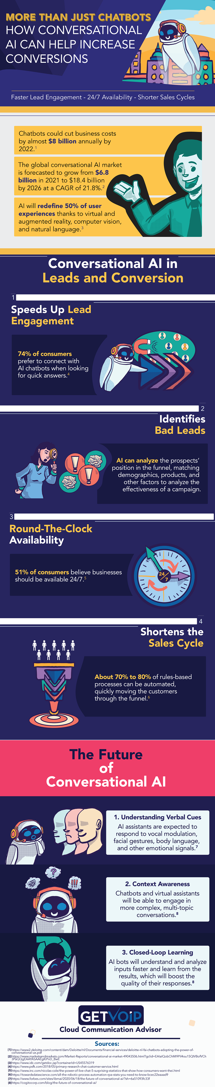 The infographic below from our friends over at GetVoIP summarizes how conversational AI can help increase conversations. Conversational AI can keep leads engaged around the clock, disqualify bad leads, and shorten the sales cycle.