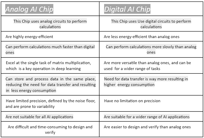 - Energy Efficiency: Analog Ai chips are much more energy efficient when comparing with digital AI chip. This is because analog clip can perform calculations directly within their own memory, which reduces the need for data transfer hence resulting in less energy consumptions. Some sources even claim that these chips can be tens to hundreds of time more efficient.