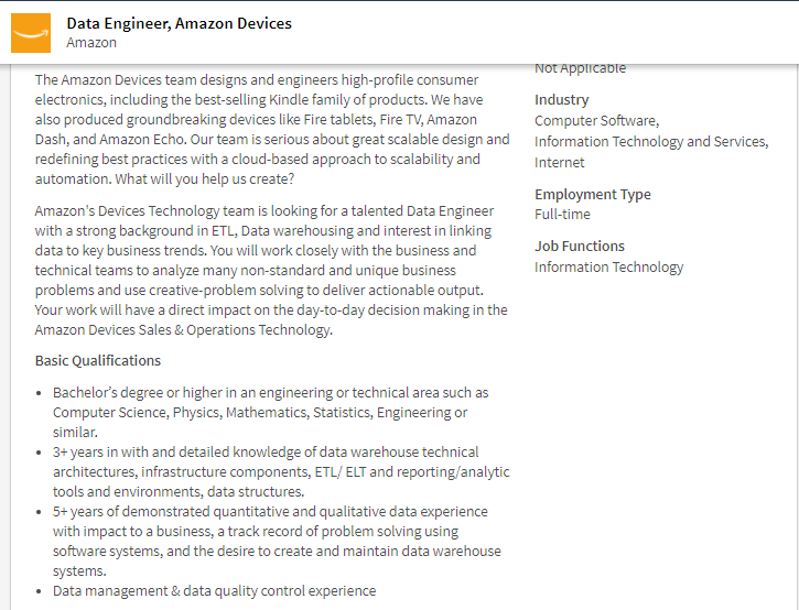 Intrigued, I looked at the job descriptions of Data engineer job postings by leading data-driven companies like Amazon and Facebook on LinkedIn. Strong Data Warehouse skills with a thorough knowledge of Data Extraction, Transformation, loading (ETL) processes and Data Pipeline construction expertise stood out as the essential and basic qualifications of an ideal Data Engineer.