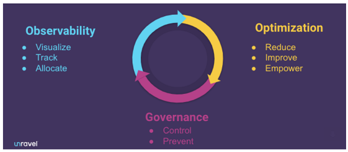 - Observability: Before organizations can tackle costs, they need fine-grained visibility. Observability gives a holistic view of applications, workloads, users, data, and resources. During this phase, trends and patterns that reveal how the cost of cloud resources changes over time emerge, allowing for the next step in the process.