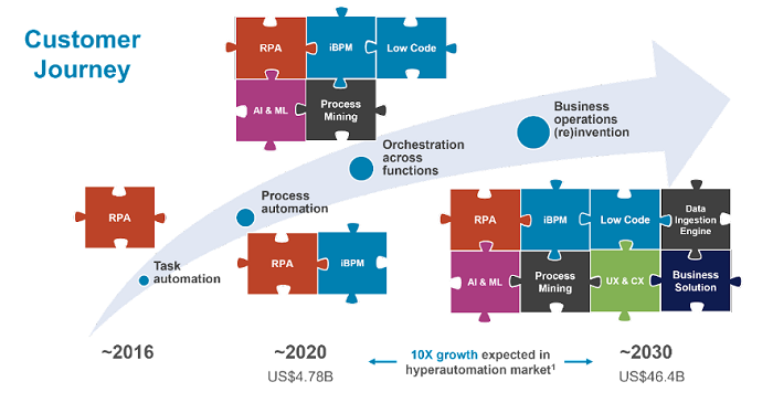 Fig.1 illustrates the elements of hyperautomation as “puzzle pieces” in a business-driven technology framework that accelerates digital transformation initiatives. From left to right, you can see how adoption can start from task automation all the way to the re-invention of your business operations. It bears mentioning that the hyperautomation market is estimated to reach US$46.4 billion by 2031 and grow at a CAGR 21.7% between 2021-2031 according to research done by Sheer Analytics and Insights Pvt. Ltd. This is where enterprises are prioritizing their IT spend.